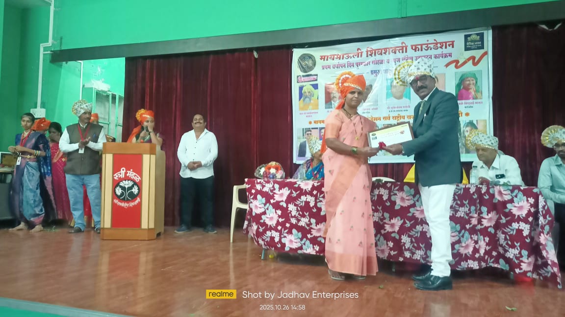 नाशिक. मायमाऊली शिवशक्ती फाउंडेशन व दैनिक भारत नॅशनल चैनल चे उद्घाटन तर्फे दिला जाणारा महाराष्ट्र समाजभूषण हा राज्यस्तरीय सन्मान यावर्षी सामाजिक कार्यकर्ते सौ संगीता मिसाळ यांना . सन्मानित केले. केलेल्या उल्लखणीय कार्याची दखल घेत हा सन्मान देण्यात आला. हा पुरस्कार महंत डॉ श्री भक्तीचरणदास महाराज, ज्येष्ठ पत्रकार रायगडचे अध्यक्ष सत्यमेव चे संपादक श्री जयप्रकाश पवार सर, मायमाऊली शिवशक्ती फाउंडेशनचे अध्यक्ष डॉक्टर संदीप काकड, मार्गदर्शक सिंधुतबाई काकड, कर्तव्यदक्ष पोलीस मित्र फाउंडेशनचे अध्यक्ष श्री सुनील सिंग परदेशी, जेष्ठ वकील आडवोकेट श्री विलास आंधळे तसेच मायमाऊली न्यूज चे संपादक डॉ. शाम जाधव, हरिभक्त परायण याचे श्री रामभाऊ आवारे, जेष्ठ पत्रकार जयप्रकाश पवार . यांच्या हस्ते संगीता मिसाळ यांना हा पुरस्कार सन्मानित करण्यात आले. त्याप्रसंगी राष्ट्रीय महिला अध्यक्षा सौ रेखा काकड , राष्ट्रीय युवा अध्यक्ष चि. साहिल काकड, सौ राजनंदिनी आहिरे, वैशाली सकपाळे , डॉ.प्राजक्ता जठार, रमेश गिरी वंदे महाराष्ट्र न्यूज उपसंपादक नाशिक, सौ कल्पनाताई सोनार, योग गुरु बाळासाहेब मोकळ, संगीता मिसाळ अहिल्यानगर, अँकर अश्विनी पुरी, वामन शिंदे वंदे महाराष्ट्र न्यूज प्रतिनिधी बागलाण सटाणा भास्कर सायमन नेवासा जेष्ठ कवी व चंदन बाफना अहिल्यानगर व मायमाऊली शिवशक्ती फौंडेशन सर्व पदाधिकारी आदी मान्यवर या प्रसंगी उपस्थित होते.