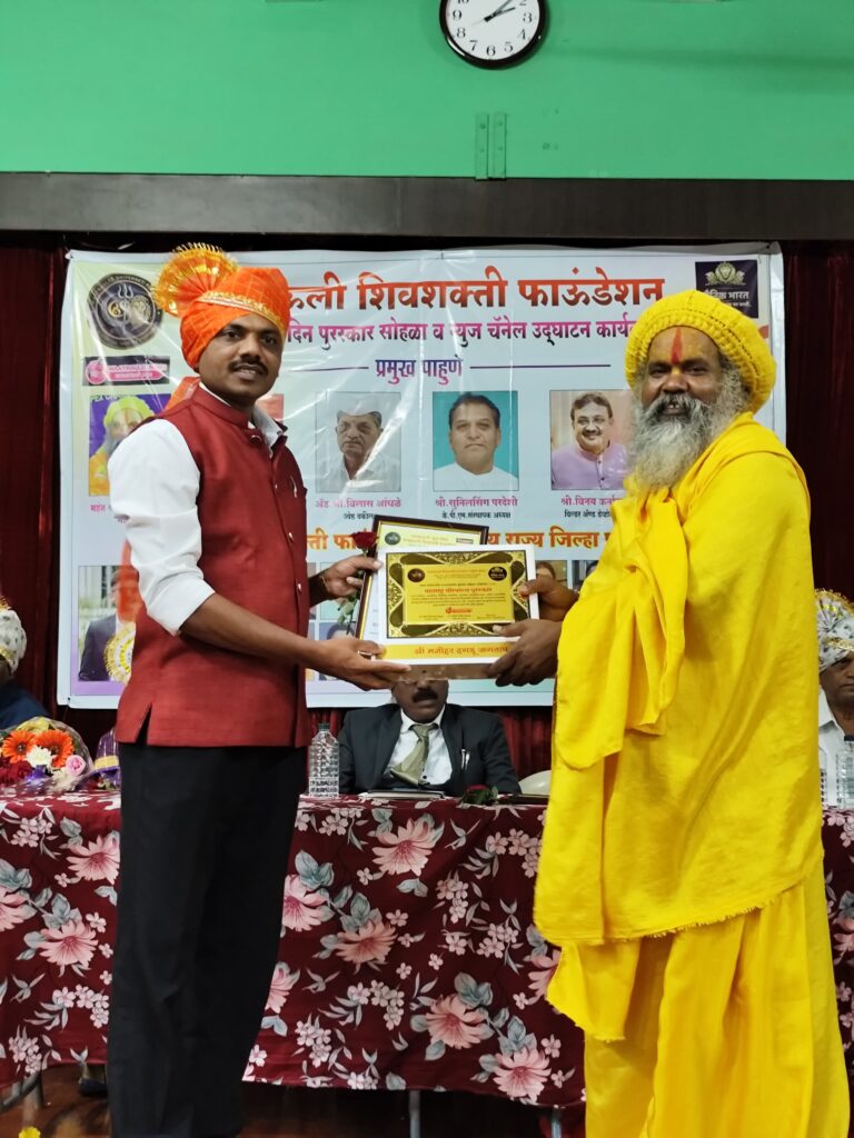 नाशिक. मायमाऊली शिवशक्ती फाउंडेशन व दैनिक भारत नॅशनल चैनल चे उद्घाटन तर्फे दिला जाणारा महाराष्ट्र गौरवरत्न हा राज्यस्तरीय सन्मान यावर्षी सामाजिक कार्यकर्त व शक्ती विकास एकॅडमी चे अध्यक्ष व नागरी संरक्षण दल पंचवटी विभागीय क्षेत्र रक्षक श्री मनोहर दगडू जगताप यांना सन्मानित करण्यात आले. त्यांनी केलेल्या उल्लखणीय कार्याची दखल घेत हा सन्मान देण्यात आला. हा पुरस्कार महंत डॉ श्री भक्तीचरणदास महाराज आखाडा प्रमुख अध्यक्ष ,”कोकण प्रदेश अध्यक्ष -प्रेस संपादक व पत्रकार सेवा संघ महाराष्ट्र
