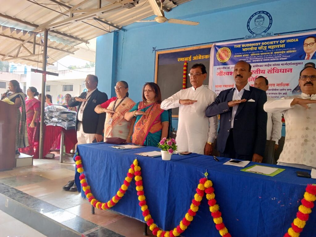नाशिक आज दिनांक२६/११/२०२५आज रोजी संविधान दिनी माता रमाबाई आंबेडकर विद्यालय नाशिक येथे ५ वी ते १२ वीत प्रथम क्रमांकाने उत्तीर्ण विद्यार्थिनींना स्कूल बॅग,१२ वह्या, कंपास पेटी, पेन आणि भीम योद्धा प्रशीस्त गौरव प्रमाणपत्र उर्वरित सर्व विद्यार्थिनींना २००पेजेस वही, पेन भेट म्हणून अदा करण्यात आले. यासाठी प्राचार्य आयु. रूपाली जोपुलकर मॅडम यांचे सहकार्य झाल्याने आयु. बुधाजी वाढविंदे साहेब अध्यक्ष महा.राज्य, आयु. हेमंत जाधव साहेब महासचिव महा. राज्य, आयु. निरंजन जाधव सर, आयु. रंभाबाई भालेराव मॅडम जिल्हा अध्यक्षा. आयु ॲड सुधाकरजी के.अहिरे साहेब. उपाध्यक्ष भारतीय बौध्द महासभा नाशिक, आयु. शालिनी अहिरे तालुका उपाध्यक्ष, आयु. जयश्री पवार मॅडम, देवळा तालुका अध्यक्ष, भा.बौ.महासभा यांचे कडून देण्यात येऊन गौरविण्यात आले.तसेच माजी पदाधिकारी डॉ. गौतम खरे साहेब, डॉ. अशोक पगारे सर, PSI महेन्द्र बर्वे, अशोक मोरे सर भा बौ महासभा सदर कार्यक्रमास उपस्थित होते. वरिष्ठ ॲड. जयदीप मोरे आणि ॲड ए. ए पठाण साहेब हजर होते. प्रथम महामानव डॉ बाबासाहेब आंबेडकर माता रमाई आंबेडकर, आणि तथागत गौतम बुद्ध यांना पुष्प अर्पण करण्यात येऊन पंचशील व संविधान शपथ ग्रहण करून उपस्थित विद्यार्थी यांना संविधान बाबत वक्ते यांनी भाषणे केली आणि संविधानाचे महत्त्व,उपयोग समजुन सांगितला आणि उपस्थित यांचे आभार मानून संविधान दिन उत्साहात साजरा करण्यात आला. जय संविधान, जय भीम.