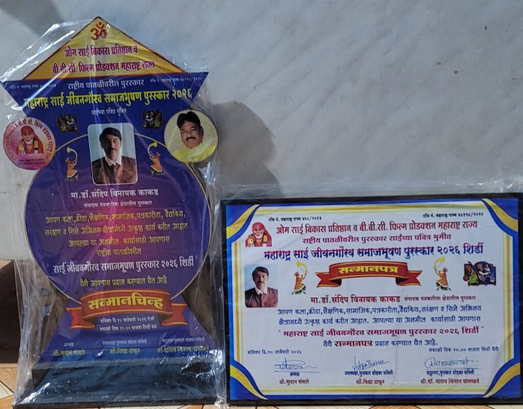शिर्डीत भव्य व दिव्य ऐतिहासिक सुवर्ण साई जिवनगौरव समाजभूषण पुरस्कार 2026 संपन्न दैनिक भारत मुख्य संपादक डॉ. संदीप काकड नाशिक यांना राष्ट्रीय जीवन गौरव समाजभूषण पुरस्कार ने सन्मानित करण्यात आले.ते मायमाऊली शिवशक्ती फौंडेशन चे संस्थापक अध्यक्ष आहेत. तसेच रुद्रा समुपदेशन केंद्र व हिलिंग सेंटर चे संचालक व प्रसिद्ध समाजसेवक म्हणून त्यांची ख्याती आहे. पत्रकार क्षेत्रात व आध्यत्मिक क्षेत्रात उल्लेखनीय कार्य असलेले डॉ संदीप काकड यांना पुरस्कार प्रदान करण्यात आला.