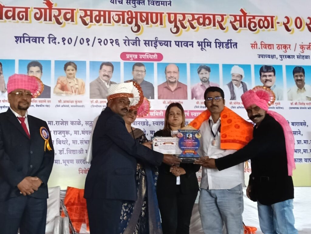 शिर्डी आज रोजी ओम साई विकास प्रतिष्ठान व बी.बी.सी.फिल्म प्रोडक्शन महाराष्ट्र राज्य निर्मित राष्ट्रीय पातळीवरील साई जिवनगौरव समाजभूषण पुरस्कार.2026. हा दिनांक. 10.जानेवारी.वार.शनिवार. रोजी.ठिक सकाळीच 10:00वाजता.शिर्डीत परिवार लाॅन्स. बॅंकेट हाॅल. न्यु रिंग रोड सिटी मार्केट शेजारी.इंडियन पेट्रोल पंप पासुन जवळच शिर्डीत या भव्य व दिव्य पुरस्कार सोहळ्यास महाराष्ट्र राज्यातील वेगवेगळ्या क्षेत्रातील कार्य करत असलेल्या २५५ मान्यवरांना सन्मानित करण्यात आले .या पुरस्कार सोहळ्यास विशेष उपस्थितीत सिनेमा सृष्टीतील नामांकित सेलेब्रिटीज तसेच सामाजिक क्षेत्रातील नामवंत समाज सेवक व कृषीविषयक क्षेत्रातील नामवंत कृषीतज्ज्ञ आणि उद्योजक क्षेत्रातील नामवंत उद्योजक व शैक्षणिक क्षेत्रातील शिक्षणतज्ज्ञ. आशा मान्यवरांच्या शुभ हस्ते हा पुरस्कार वितरण समारंभ संपन्न .
