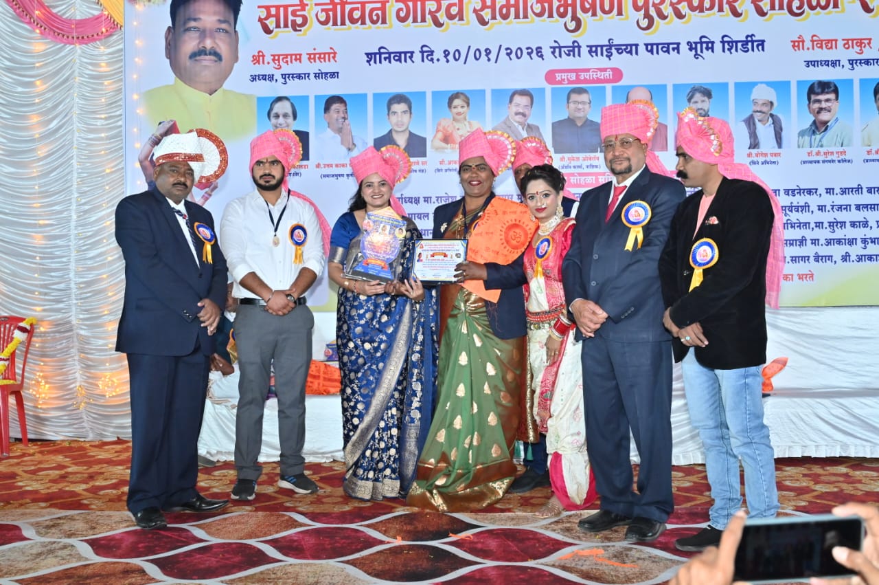 नाशिक शिर्डी आज रोजी ओम साई विकास प्रतिष्ठान व बी.बी.सी.फिल्म प्रोडक्शन महाराष्ट्र राज्य निर्मित राष्ट्रीय पातळीवरील साई जिवनगौरव समाजभूषण पुरस्कार.2026. हा दिनांक. 10.जानेवारी.वार.शनिवार. रोजी.ठिक सकाळीच 10:00वाजता.शिर्डीत परिवार लाॅन्स. बॅंकेट हाॅल. न्यु रिंग रोड सिटी मार्केट शेजारी.इंडियन पेट्रोल पंप पासुन जवळच शिर्डीत या भव्य व दिव्य पुरस्कार सोहळ्यास महाराष्ट्र राज्यातील वेगवेगळ्या क्षेत्रातील कार्य करत असलेल्या २५५ मान्यवरांना सन्मानित करण्यात आले .