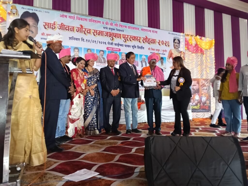 नाशिक शिर्डी आज रोजी ओम साई विकास प्रतिष्ठान व बी.बी.सी.फिल्म प्रोडक्शन महाराष्ट्र राज्य निर्मित राष्ट्रीय पातळीवरील साई जिवनगौरव समाजभूषण पुरस्कार.2026. हा दिनांक. 10.जानेवारी.वार.शनिवार. रोजी.ठिक सकाळीच 10:00वाजता.शिर्डीत परिवार लाॅन्स. बॅंकेट हाॅल. न्यु रिंग रोड सिटी मार्केट शेजारी.इंडियन पेट्रोल पंप पासुन जवळच शिर्डीत या भव्य व दिव्य पुरस्कार सोहळ्यास महाराष्ट्र राज्यातील वेगवेगळ्या क्षेत्रातील कार्य करत असलेल्या २५५ मान्यवरांना सन्मानित करण्यात आले .या पुरस्कार सोहळ्यास विशेष उपस्थितीत सिनेमा सृष्टीतील नामांकित सेलेब्रिटीज तसेच सामाजिक क्षेत्रातील नामवंत समाज सेवक व कृषीविषयक क्षेत्रातील नामवंत कृषीतज्ज्ञ आणि उद्योजक क्षेत्रातील नामवंत उद्योजक व शैक्षणिक क्षेत्रातील शिक्षणतज्ज्ञ. आशा मान्यवरांच्या शुभ हस्ते हा पुरस्कार वितरण समारंभ संपन्न .हा पुरस्कार सोहळा न भुतो न भविष्य ते आसा सुमधूर वादयाच्या गजरात व शोभेच्या दारूच्या अतिषबाजीत आणि रंगीबेरंगी लाईटींग च्या लखलखीत झगमगाटात या पुरस्कार साठी सोहळा समितीतील. मा.अध्यक्ष तथा सर्वेसर्वा श्री.सुदाम संसारे.सर मा.उपाध्यक्षा.सौ.विद्या ठाकुर/कार्याध्यक्ष मा. राजेश काळे. सल्लागार. मा.डाॅ.माधव वानखडे.सरचिटणीस मा.संभाजीराव खैरे. स्वागताध्यक्षा.मा.सौ.राजनंदीनी अहिरे,मा.कविता वडनेरकर.,मा.आरती बारवसे,मा.प्रिती म्हसदे,मा.मिनाक्षी अहिरे,मा.रंजना बलसाने, पायल राजगुरु,मा.मंगला विरशिद, संयोजक मा दीपक गरुड,मा.शंकरराव कन्हेरकर,मा.राजेश भांगे,मा.सागर बैरागी,मा.विशाल पवार,मा.सुनिल काळे,तसेच प्रसिद्धी प्रमुख मा.वजीर शेख,मा रामभाऊ आवारे,मा.डाॅ.शाम जाधव,मा.प्रदीप मगरे,मा डॉ. संदीप काकड ,मा.राजपुत सर.तसेच पुरस्कार सोहळा समितीतील सर्व पदाधिकारी उपस्थित होते
