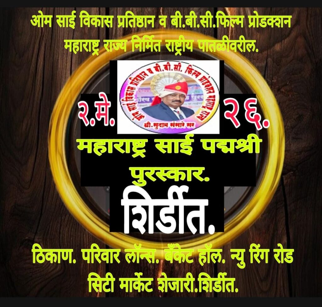 शिर्डी आज रोजी ओम साई विकास प्रतिष्ठान व बी.बी.सी.फिल्म प्रोडक्शन महाराष्ट्र राज्य निर्मित *राष्ट्रीय पातळीवरील महाराष्ट्र साई पद्मश्री पुरस्कार. 2026* ÷=÷= अध्यक्ष =श्री.सुदाम संसारे..हा पद्मश्री पुरस्कार सोहळा .साई च्या नावाने तसेच साई च्या पदस्पर्शाने पावन व पवित्र भुमित शिर्डीत होत आहे.हा भव्य व दिव्य *महाराष्ट्र साई पद्मश्री पुरस्कार. सोहळा÷ दिनांक. 02.मे.2026*.वार.शनिवार. रोजी सकाळीच ठिक 9:30.वाजता आयोजित करण्यात आला आहे.या पुरस्कार सोहळ्यास संपूर्ण महाराष्ट्र राज्यातील वेगवेगळ्या 36.प्रकारच्या विविध क्षेत्रात कार्यरत असलेले तसेच या क्षेत्रात उल्लेखनीय कार्य करत आहेत व केले आहे.आशा मान्यवर व्यक्तीचां पहिल्यांदाच महाराष्ट्र साई पद्मश्री पुरस्कार देऊन गौरविण्यात येणार आहे.हा भव्य व दिव्य पुरस्कार सोहळा शिर्डीत *परिवार लाॅन्स बॅंकेट हाॅल,न्यू रिंग रोड सिटी मार्केट शेजारी.इंडियन पेट्रोल पंप पासुन जवळच शिर्डीत* होत आहे.तरी या आगळ्या वेगळया पद्मश्री पुरस्कार सोहळ्यास पुरस्कार घेण्या साठी तुमच्या नावाची नोंद 9689467506.या मोबाईल नंबर वर करावी व आपला पद्मश्री पुरस्कार निश्चित करावा नाव नोंदणी धुमधडाक्यात चालु आहे.या पुरस्कार सोहळ्यास नियोजन सोहळा समिती अतिशय मेहनत घेत आहे.तरी या सुवर्ण संधीचा आवश्य फायदा घ्या या पद्मश्री पुरस्कार सोहळ्याचे स्वरुप 1)भव्य व दिव्य गोल्डन ट्रॉफी. 2)फोटो फ्रेम केलेले रंगीत सन्मानपत्र. 3)एक साई ची मानाची शाल.4)भव्य व रुबाबदार. कोल्हापूरी फेटा.5)एक गोल्ड मेडल. 6)एक पुष्पगुच्छ. 7)एक कापडी थैली.8)शेवटी पंचपक्वान्नाचे भोजन.9)पुरस्कार च्या शेवटी एक लक्की ड्राॅ.त्यात 12.भाग्यवान महिलांना 12.नग पैठणी साडया व 12.भाग्यवान पुरुषांना 12.नग पॅट पीस व शर्ट पीस.देण्यात येणार आहे.