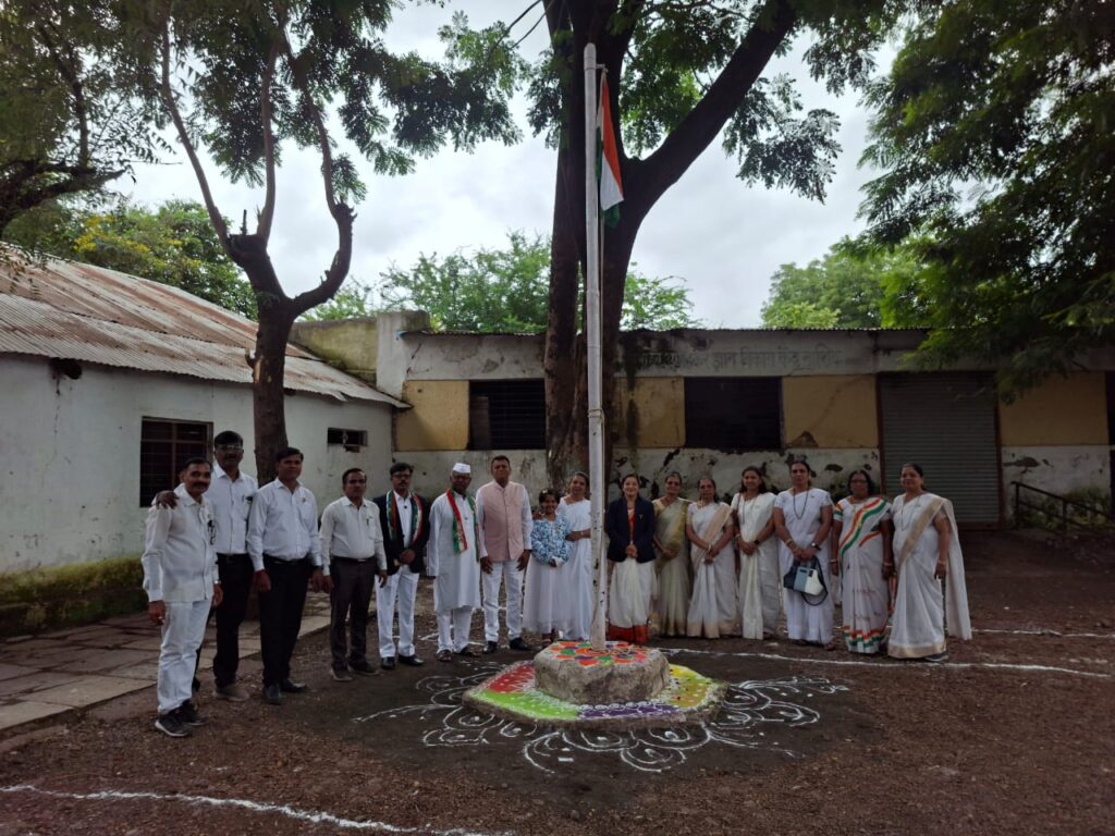 तसेच विद्यालया तर्फे वीरमाता लीलावती माणिक माने यांना गौरविण्यात आले. उपस्थित मान्यवरांचे शाल श्रीफळ देऊन कार्यक्रम प्रसंगी सत्कार करण्यात आला. कार्यक्रमाचे सूत्रसंचालन श्रीमती नीलिमा राऊत यांनी केले. पाहुण्यांच्या परिचय श्रीमती मंगला पाटील मॅडम यांनी करून दिला तर शाळेचे मुख्याध्यापक श्री पांडे सर यांनी आभार मानले. कार्यक्रम यशस्वी होण्यासाठी उपशिक्षक श्री देवरे एल बी, श्री पवार एस टी शिक्षक , उपशिक्षिका श्रीमती पगारे नंदिनी एन,श्रीमती एम .एच .पाटील, उपशिक्षक ए .यु. शिंदे, उपशिक्षिका, एन .एस .राऊत तसेच सर्व शिक्षक शिक्षकेतर कर्मचाऱ्यांचे सहकार्य लाभले. अश्विनी गायकवाड मॅडम बिचवे मॅडम यांनी देशभक्तीपर कवायत बसवून घेतले. टाटा बिल्डकॉन इंडिया तर्फे घेण्यात आलेल्या निबंध स्पर्धेमध्ये यश संपादन केलेल्या विद्यार्थ्यांचा सर्टिफिकेट गोल्ड मेडल देऊन सत्कार करण्यात आला सर्व विद्यार्थ्यांना मिठाई ,केळी ,बिस्किट इत्यादी अल्पोबार देण्यात आला ,त्यांचा आनंदात सहभागी झालेले शिक्षक व वृंदावन अगदी आनंदी वातावरणात ध्वजारोहण कार्यक्रम पार पडला.