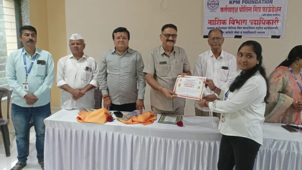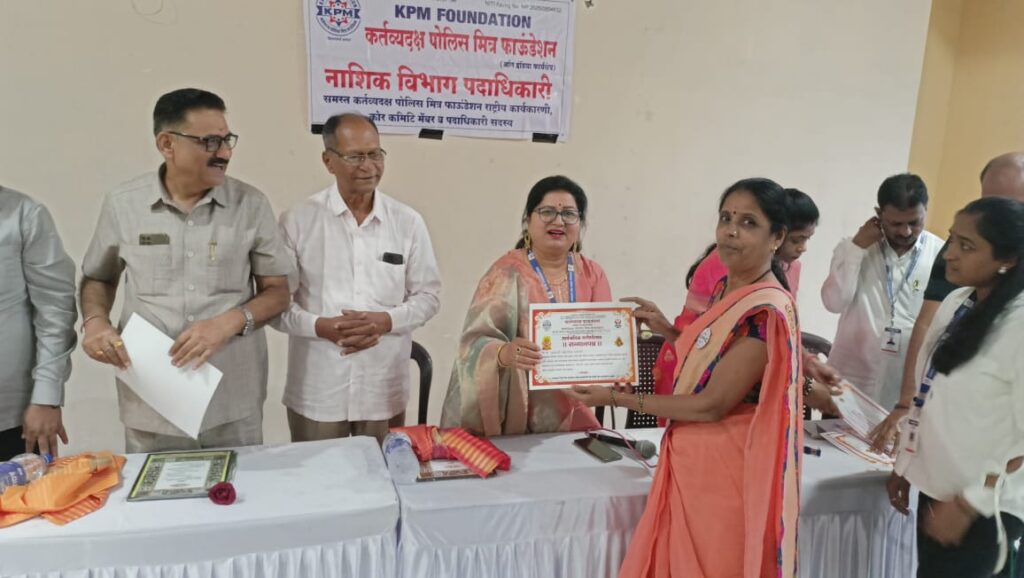 दि. 14 सप्टेंबर 2025 रोजी नाशिक येथे कर्तव्यदक्ष पोलीस मित्र फौंडेशन तर्फे आयडी कार्ड वाटप व सन्मान सोहळा आयोजित करण्यात आला होता. यावेळी गणेशउत्सव मध्ये अनेक उपक्रम संस्था तर्फे राबविण्यात आले त्यामध्ये सहभाग व छान कार्या साठी सन्मानपत्र देण्यात आले. सौ ज्योती जोशी व सौ प्रिया भारते कर्तव्यदक्ष पोलीस मित्र फौंडेशन पदाधिकारी यांच्या कार्याबद्दल त्यांना मान्यवरांच्या हस्ते सन्मानित करण्यात आले. यावेळी संस्थापक अध्यक्ष सुनिलभाऊ परदेशीं, प्रमुख पाहुणे माजी रिटायर्ड सहाय्यक पोलीस आयुक्त मुबंई श्री केशवराव गायकवाड, रिटायर्ड ACP श्री प्रभाकर रायते, माजी नगरसेवक श्री जगदीश पाटील, संस्था चे राष्ट्रीय डायरेक्टर श्री राजेंद्र आहेर , सौ आरती आहिरे, सौ रोहिणी कुमावत, डॉ संदीप काकड यांच्या उपस्थिती मध्ये कार्यक्रम संपन्न झाला व यावेळी सर्व पदाधिकारी उपस्थित होते.
